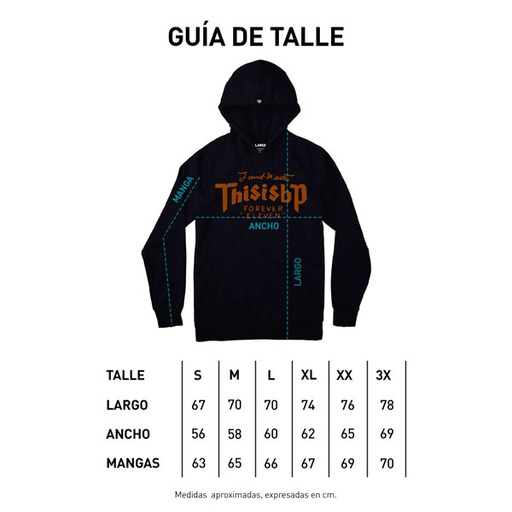◦ Buzo canguro. ◦ Frisa peinada. ◦ Composición 35% algodón peruano 65% poliéster. ◦ Capucha repartida con cordón de ajuste al tono.◦ Etiquetas tejidas de marca y talle.◦ Producto fabricado en Perú.