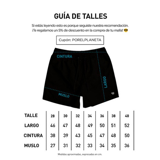 ◦ Malla con cintura rígida con cordón de ajuste y velcro. Confeccionada en Microfibra 4 Way lisa y sublimada con estampado original en cintura interna y vivos combinados, cuenta con protección UV+50 y secado rápido, aumentando la eficiencia en el agua y durabilidad de la prenda. Estampa en delantero a un color. ◦ Bolsillos laterales. ◦ Fit 19". ◦ Composición: 96% Poliéster 4% Elastano. ◦ Producto nacional.