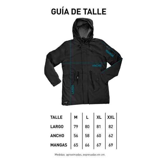 Twill. 100% Poléster. Interior corderito sintético. Tratamiento repelente al agua T400W. Tapa cierre frontal. Cierre y snaps metálicos. Bolsillos frontales. Capucha y cintura con cordón y tancas de ajuste. Producto importado