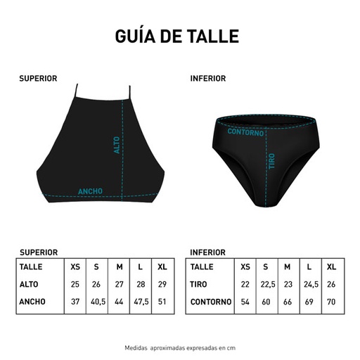 ◦ Top con escote americano y espalda regulable, bombacha vedetina. ◦Acompañado de un neceser de PVC transparente con trama propia con 2 broches snaps para cierre. ◦ Confeccionada en Tricot liso con vivos en contratono, cuenta con protección UV +50 y secado rápido, aumentando la eficiencia en el agua y durabilidad de la prenda. ◦ Composición: 100% Poliéster ◦ Producto nacional.